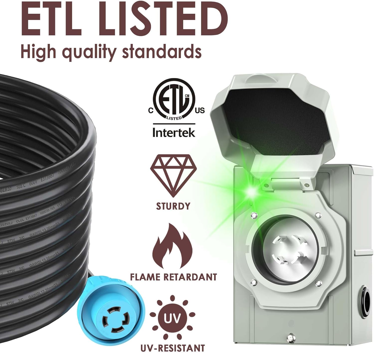 • ETL Listed: High quality standards. 10 gauge 4 prong SJTW 125/250V up to 7500W, NEMA L14-30P male to L14-30R female twist lock, ETL Listed