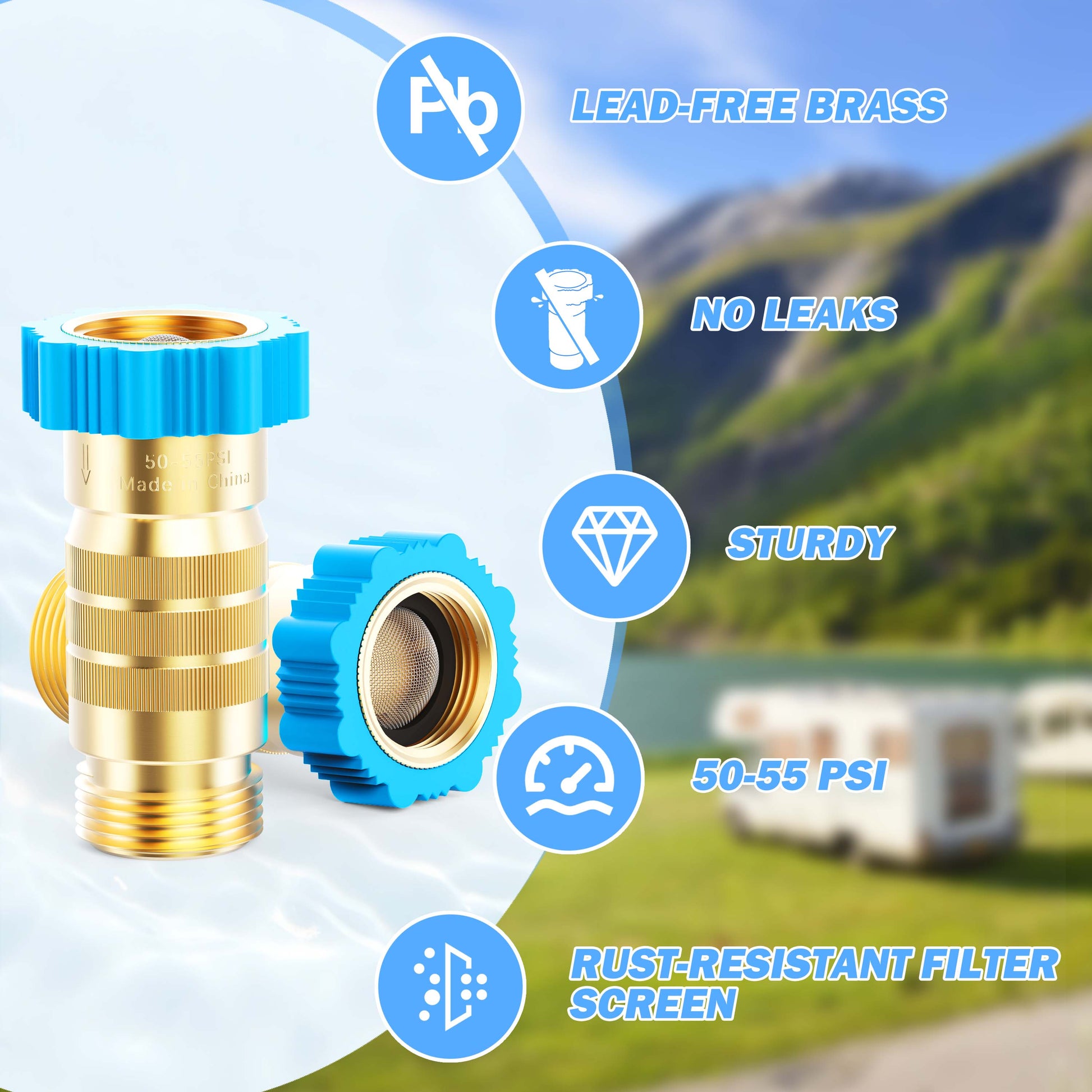 RV Hi-Flow Water Pressure Regulator 50-55 psi, 3/4 Inch Thread Lead-Free Brass Inline Water Pressure Reducer for Camper, Trailer, RV Plumbing System