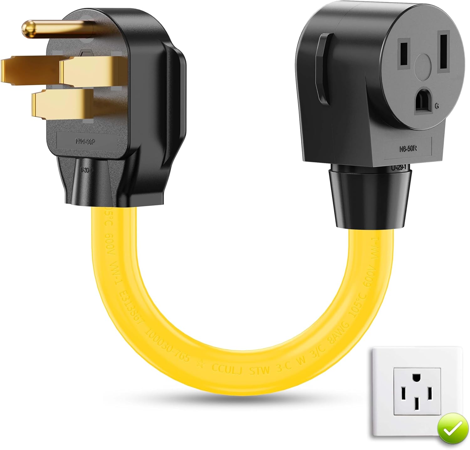 - Upgrade: Both plugs are right angle, 90-degree bent design, 50 Amp, 250 Volt, Max wattage 12500 watts, 12 Inch